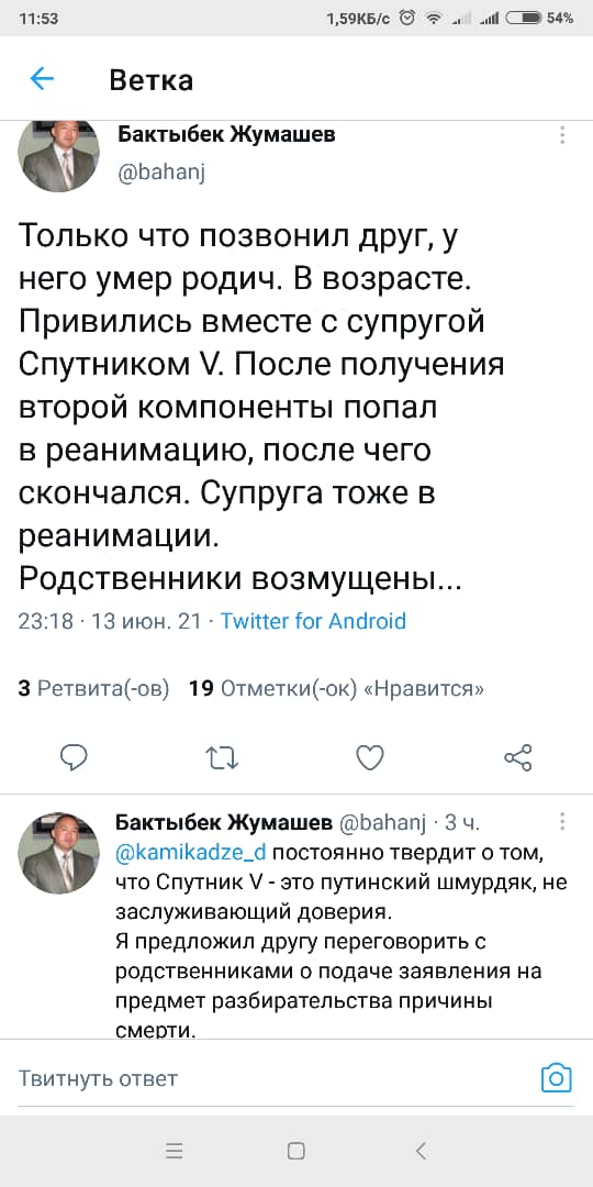 Отметим, что пользователь Twitter Бактыбек Жумашев написал о смерти пожилого человека якобы после получения второго компонента вакцины «Спутник V».