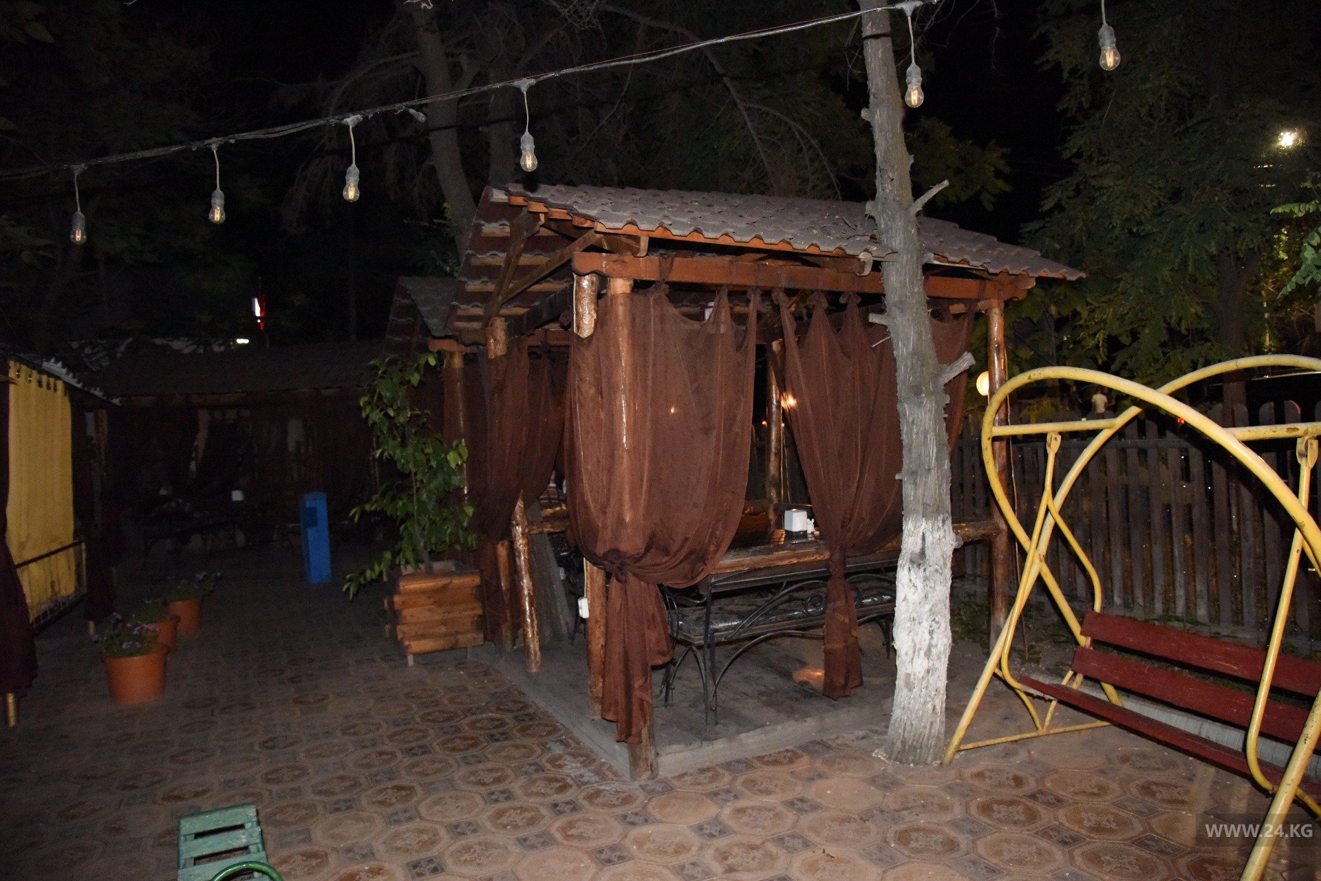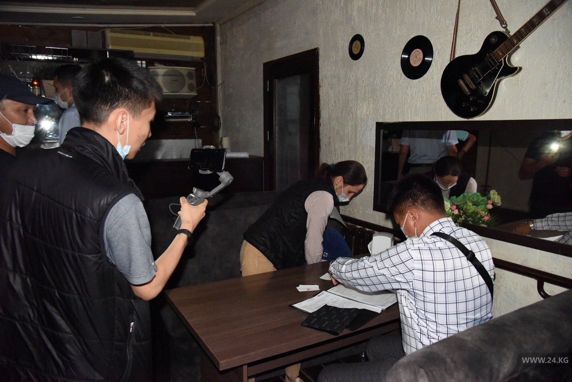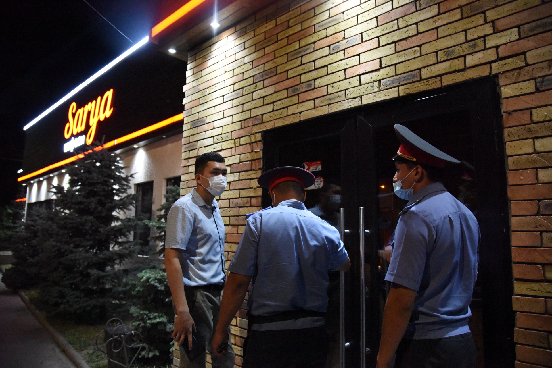Напротив караоке находится кафе «Сария». Как сообщил его охранник, заведение закрыто с 23.00. Он также любезно согласился показать инспекции и журналистам, что происходит внутри. Действительно залы оказались пустые, клиентов не было. Инспекторы подытожили, что здесь соблюдают постановление мэрии.