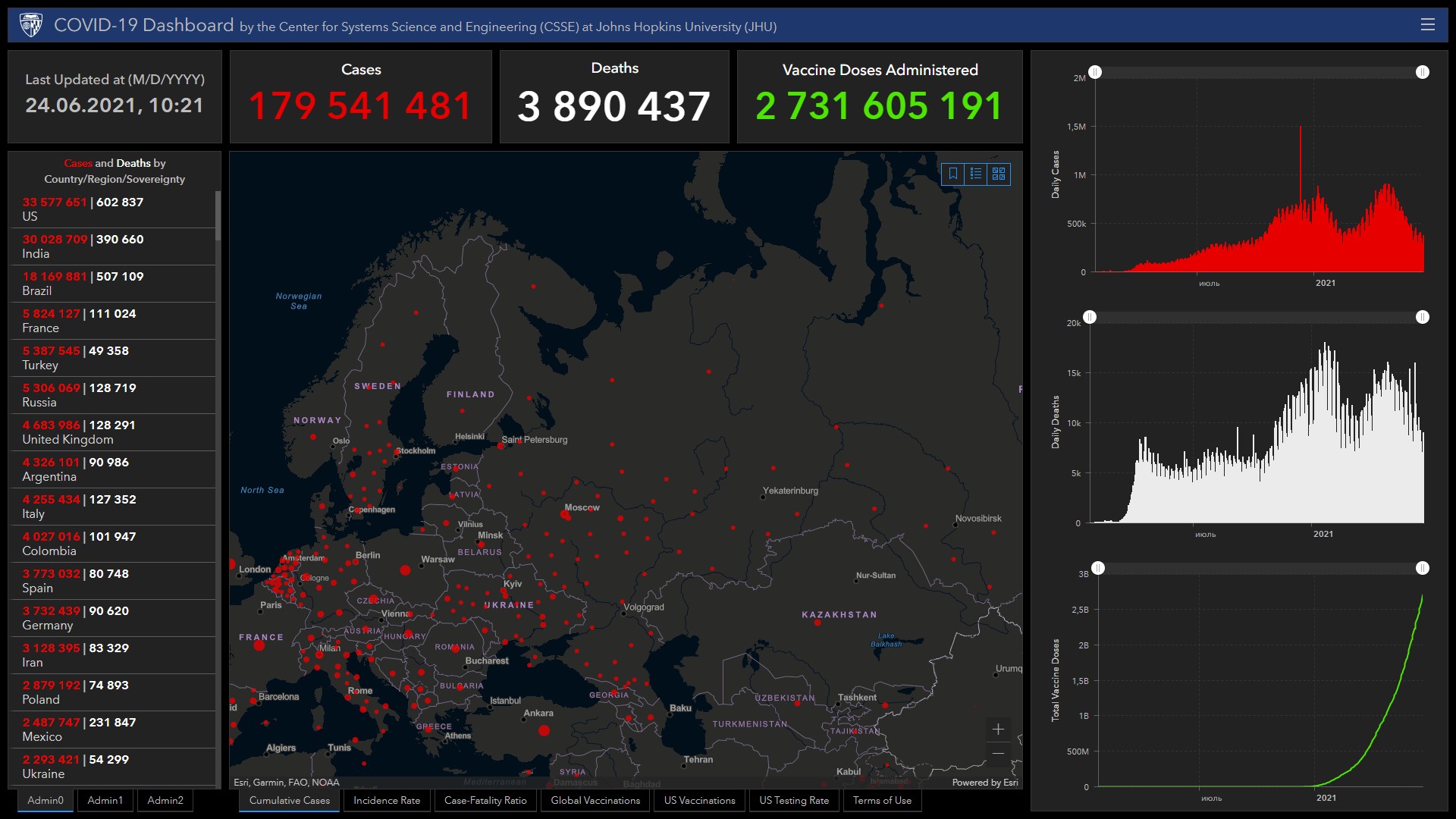 Всего в мире коронавирусом заразились 179 миллионов 541 тысяча 481 человек. Больше всего зараженных в США (33 миллиона 577 тысяч 651), Индии (30 миллионов 28 тысяч 709), Бразилии (18 миллионов 169 тысяч 881), Франции (5 миллионов 824 тысячи 127), Турции (5 миллионов 387 тысяч 545), России (5 миллионов 306 тысяч 69), Великобритании (4 миллиона 683 тысячи 986), Аргентине (4 миллиона 326 тысяч 101), Италии (4 миллиона 255 тысяч 434), Колумбии (4 миллиона 27 тысяч 16), Испании (3 миллиона 773 тысячи 32) и Германии (3 миллиона 732 тысячи 439).