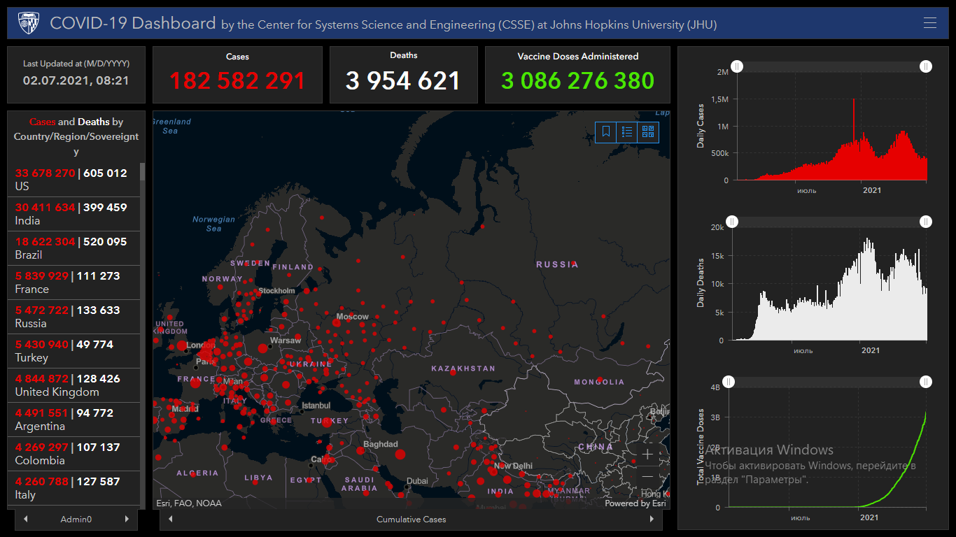 Всего в мире коронавирусом заразились 182 миллиона 582 тысячи 291 человек. Больше всего зараженных в США (33 миллиона 678 тысяч 270), Индии (30 миллионов 411 тысяч 634), Бразилии (18 миллионов 622 тысячи 304), Франции (5 миллионов 839 тысяч 929), России (5 миллионов 472 тысячи 722), Турции (5 миллионов 430 тысяч 940), Великобритании (4 миллиона 844 тысячи 872), Аргентине (4 миллиона 491 тысяча 551), Колумбии (4 миллиона 269 тысяч 297), Италии (4 миллиона 260 тысяч 788), Испании (3 миллиона 821 тысяча 305) и Германии (3 миллиона 736 тысяч 959).