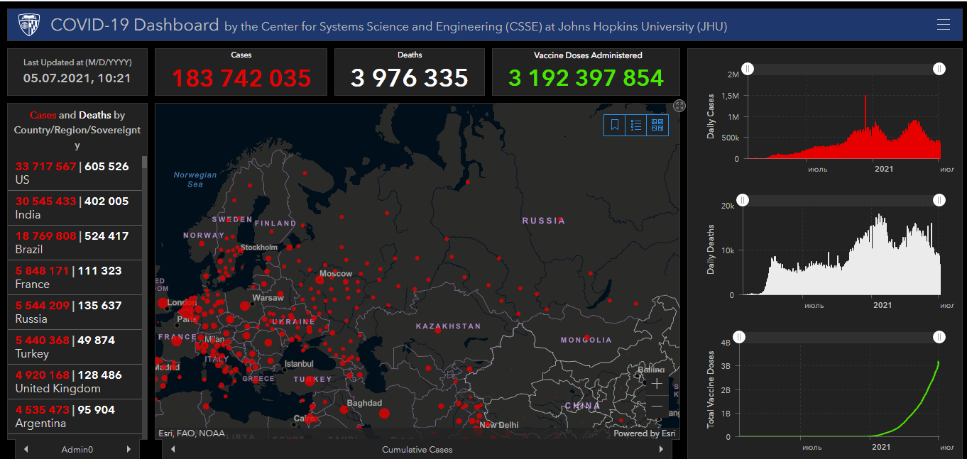 Всего в мире коронавирусом заразились 182 миллиона 582 тысячи 291 человек. Больше всего зараженных в США (33 миллиона 717 тысяч 567), Индии (30 миллионов 545 тысяч 433), Бразилии (18 миллионов 769 тысяч 808), Франции (5 миллионов 848 тысяч 171), России (5 миллионов 544 тысячи 209), Турции (5 миллионов 440 тысяч 368), Великобритании (4 миллиона 920 тысяч 168), Аргентине (4 миллиона 535 тысяч 473), Колумбии (4 миллиона 350 тысяч 495), Италии (4 миллиона 263 тысячи 317), Испании (3 миллиона 833 тысячи 868) и Германии (3 миллиона 738 тысяч 470).