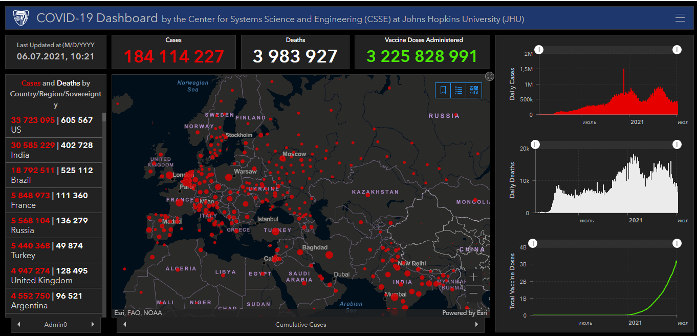 COVID-19 в мире. Заразились более 184,1 миллиона, умерли более 3,9 миллиона