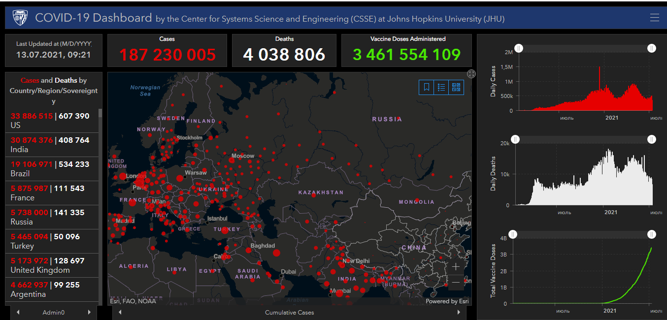 COVID-19 в мире. Заразились более 187,2 миллиона, умерли более 4 миллионов