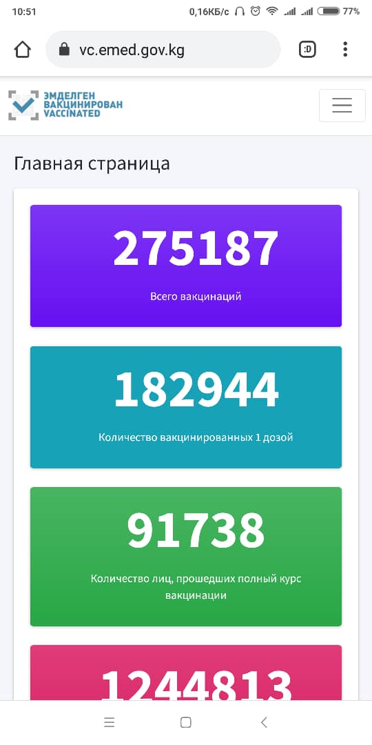 В Кыргызстане первую дозу вакцины от коронавируса получили 182 тысячи 944 человека. Такая статистика представлена на официальном сайте vc.emed.gov.kg.