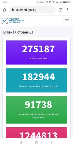 Напомним, 11 июля из Китая в КР поступило 1,25 миллиона доз вакцины Sinopharm. Сегодня во всех регионах страны проводится вакцинация против COVID-19. Открыто более 800 временных прививочных пунктов, в том числе в торговых центрах и образовательных учреждениях. Для получения прививки необходимо иметь при себе паспорт.
