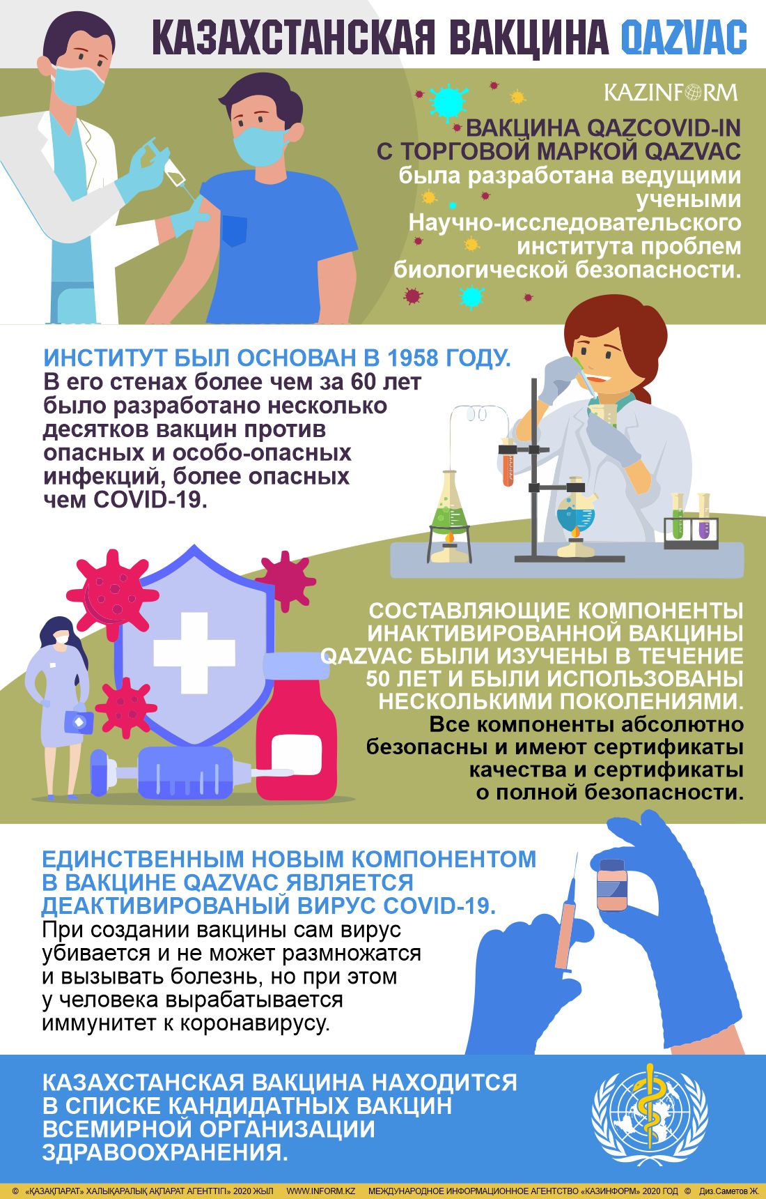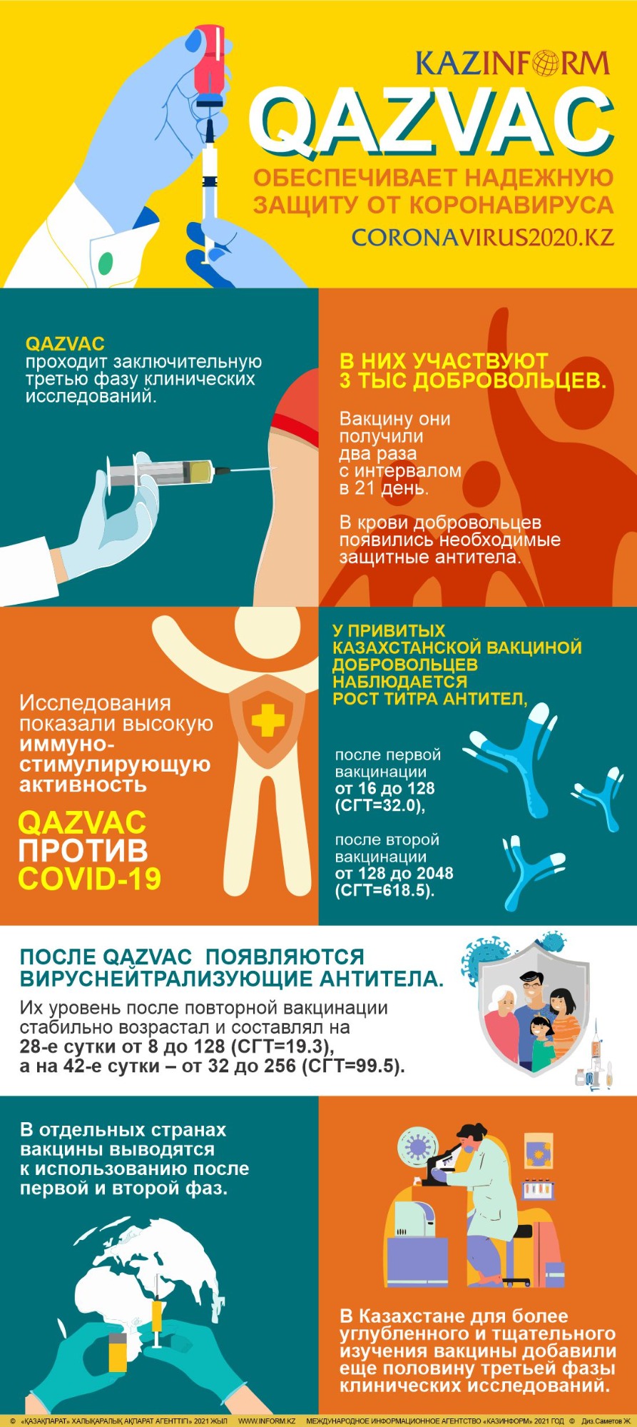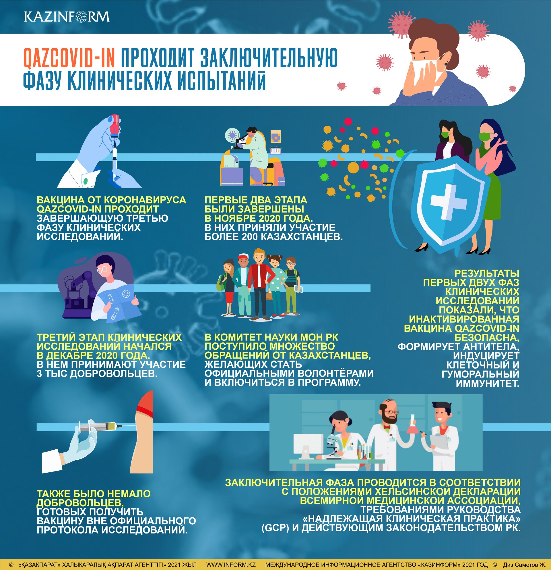 «Клинические испытания и практика ее применения в Казахстане показали безопасность вакцины QazVac и ее эффективность (свыше 90 процентов) в предотвращении заражения коронавирусной инфекцией и ее тяжелых форм», — говорится в сообщении.