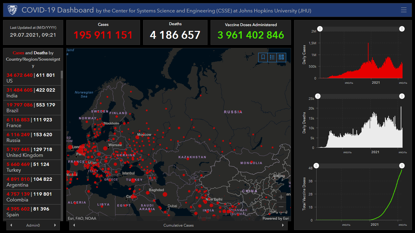 COVID-19 в мире. Заразились более 195,9 миллиона, умерли более 4,1 миллиона
