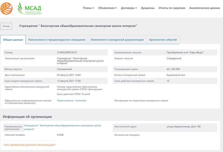 По его данным, Белогорская общеобразовательная санаторная школа-интернат объявила тендер на приобретение угля марки «Кара Жыра». Планирует потратить 421 миллион 200 тысяч сомов. Объем закупки — 93 тысячи 600 килограммов.