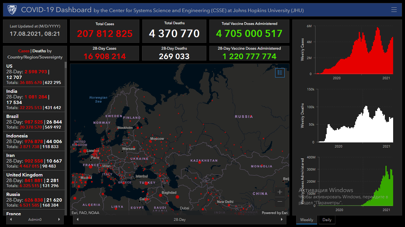 Всего в мире коронавирусом заразились 207 миллионов 812 тысяч 825 человек. Больше всего зараженных в США (36 миллионов 885 тысяч 670), Индии (32 миллиона 225 тысяч 513), Бразилии (20 миллионов 378 тысяч 570), России (6 миллионов 531 тысяча 585), Франции (6 миллионов 476 тысяч 855), Великобритании (6 миллионов 325 тысяч 515), Турции (6 миллионов 96 тысяч 786), Аргентине (5 миллионов 88 тысяч 271), Колумбии (4 миллиона 870 тысяч 922), Испании (4 миллиона 693 тысячи 540), Италии (4 миллиона 719 тысяч 266), Иране (4 миллиона 467 тысяч 15) и Германии (3 миллиона 831 тысяча 827).