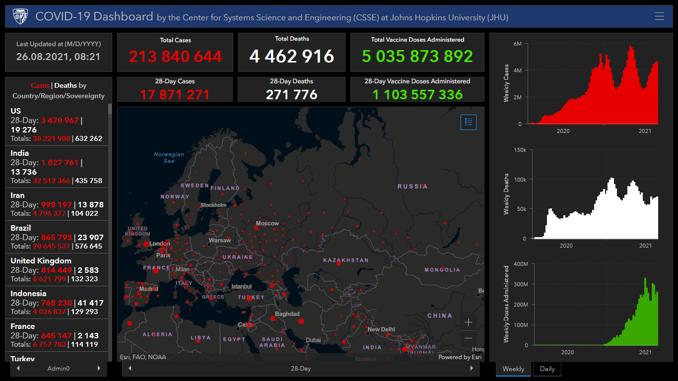 Всего в мире коронавирусом заразились 213 миллионов 840 тысяч 644 человека. Больше всего зараженных в США (38 миллионов 221 тысяча 908), Индии (32 миллиона 512 тысяч 366), Бразилии (20 миллионов 645 тысяч 537), Франции (6 миллионов 757 тысяч 783), России (6 миллионов 709 тысяч 605), Великобритании (6 миллионов 621 тысяча 799), Турции (6 миллионов 273 тысячи 651), Аргентине (5 миллионов 155 тысяч 79), Колумбии (4 миллиона 897 тысяч 150), Испании (4 миллиона 815 тысяч 205), Италии (4 миллиона 502 тысячи 396), Иране (4 миллиона 796 тысяч 377) и Германии (3 миллиона 901 тысяча 978).