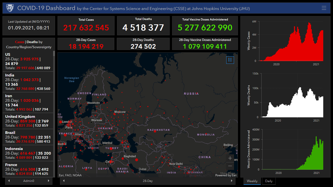 Всего в мире коронавирусом заразились 217 миллионов 632 тысячи 545 человек. Больше всего зараженных в США (39 миллионов 197 тысяч 606), Индии (32 миллиона 768 тысяч 880), Бразилии (20 миллионов 776 тысяч 870), Франции (6 миллионов 834 тысячи 858), Великобритании (6 миллионов 821 тысяча 356), России (6 миллионов 820 тысяч 697), Турции (6 миллионов 366 тысяч 408), Аргентине (5 миллионов 185 тысяч 620), Иране (4 миллиона 992 тысячи 63), Колумбии (4 миллиона 909 тысяч 86), Испании (4 миллиона 855 тысяч 65), Италии (4 миллиона 539 тысяч 991) и Германии (3 миллиона 955 тысяч 434).
