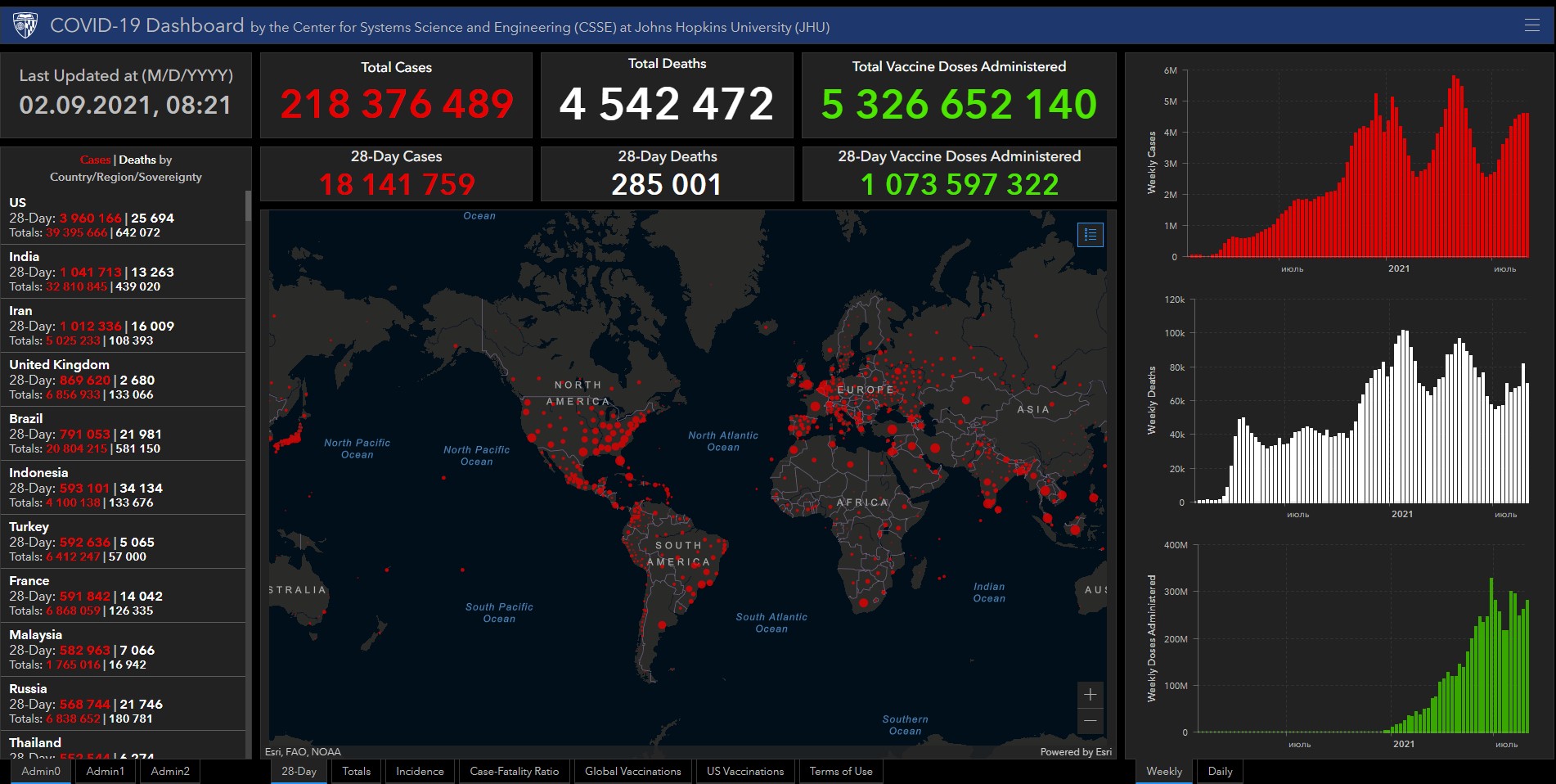 Всего в мире коронавирусом заразились 218 миллионов 376 тысяч 489 человек. Больше всего зараженных в США (39 миллионов 395 тысяч 666), Индии (32 миллиона 810 тысяч 845), Бразилии (20 миллионов 804 тысячи 215), Франции (6 миллионов 868 тысяч 59), Великобритании (6 миллионов 856 тысяч 933), России (6 миллионов 838 тысяч 652), Турции (6 миллионов 412 тысяч 247), Аргентине (5 миллионов 190 тысяч 948), Иране (5 миллионов 25 тысяч 233), Колумбии (4 миллиона 911 тысяч 82), Испании (4 миллиона 861 тысяча 883), Италии (4 миллиона 546 тысяч 487) и Германии (3 миллиона 979 тысяч 839).