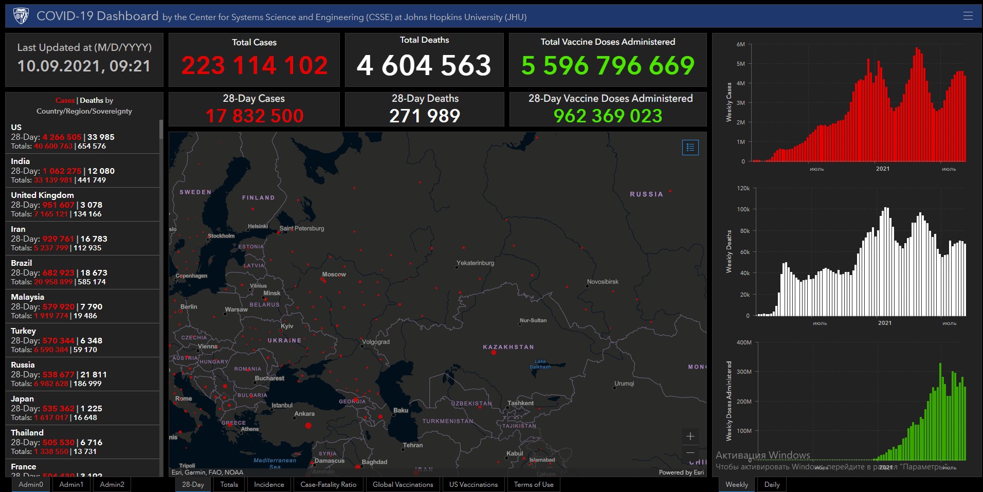 COVID-19 в мире. Заразились более 223,1 миллиона, умерли более 4,6 миллиона