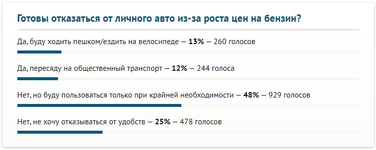 Как выяснилось, большинство автолюбителей не готовы пересесть на велосипед, ходить пешком или пользоваться общественным транспортом. 25 процентов, или 478 опрошенных не хотят отказываться от удобств. Еще 48 процентов (929 участников опроса) ответили, что не перестанут ездить на автомашине, но будут делать это при крайней необходимости.