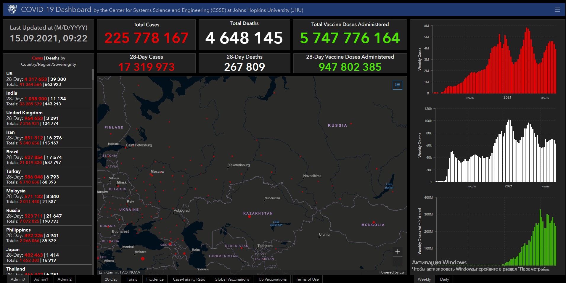COVID-19 в мире. Заразились более 225,7 миллиона, умерли более 4,6 миллиона