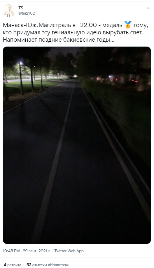 Пользователи сети уже заметили изменения и поделились фотографиями ночного Бишкека. Выглядит, откровенно говоря, мрачно.
