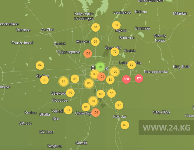 Общественный фонд «Институт экологических решений» установил датчики в столице и пригороде. На карте можно увидеть среднее значение AQI в разных районах Бишкека. Его обновляют ежечасно.