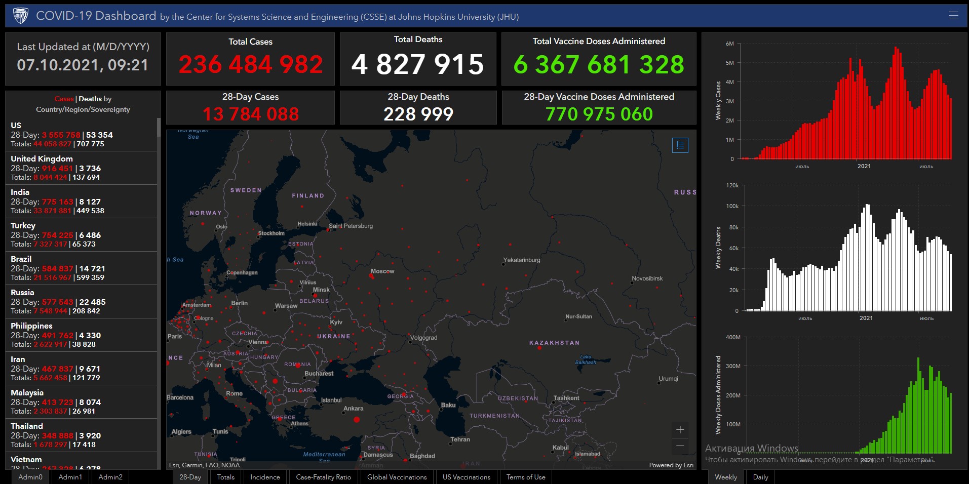 Всего в мире коронавирусом заразились 236 миллионов 484 тысячи 982 человека. Больше всего зараженных в США (44 миллиона 58 тысяч 827), Индии (33 миллиона 871 тысяча 881), Бразилии (21 миллион 516 тысяч 967), Франции (7 миллионов 310 тысяч 355), Великобритании (8 миллионов 44 тысячи 424), России (7 миллионов 548 тысяч 944), Турции (7 миллионов 327 тысяч 317), Аргентине (5 миллионов 263 тысячи 219), Иране (5 миллионов 662 тысячи 458), Колумбии (4 миллиона 965 тысяч 847), Испании (4 миллиона 969 тысяч 503), Италии (4 миллиона 689 тысяч 341) и Германии (4 миллиона 284 тысячи 400).