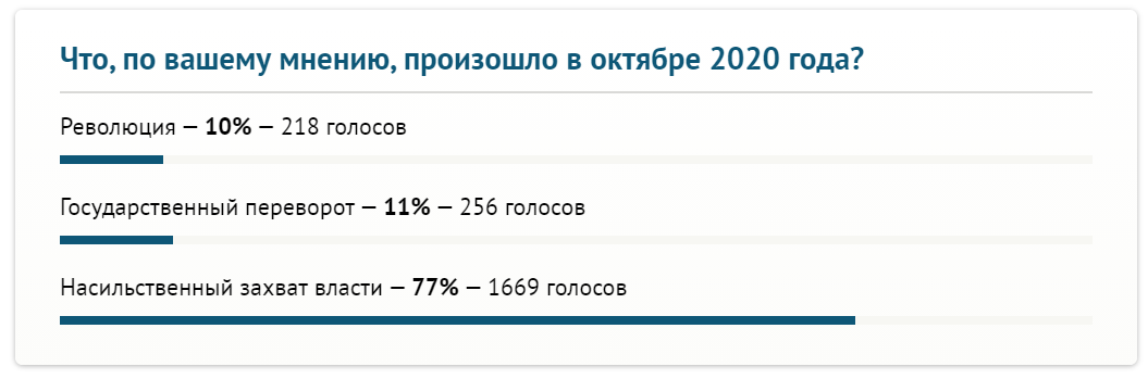 Как выяснилось, большинство опрошенных, 77 процентов, или 1 тысяча 669 человек считают, что в Кыргызстане произошел насильственный захват власти. Еще 11 процентов — 256 опрошенных называют это государственным переворотом.