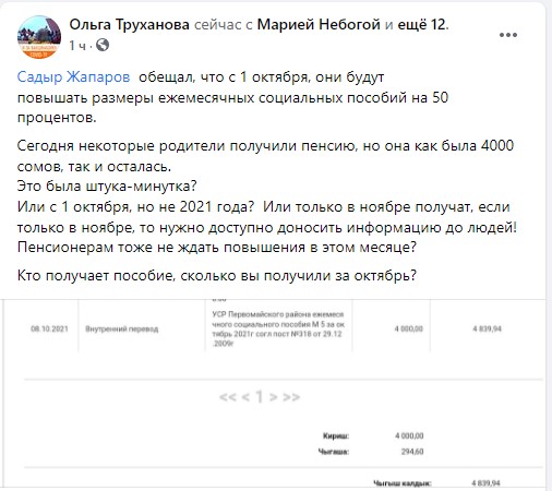 «Некоторые родители уже получили пособие детей по инвалидности за октябрь в том же размере, как и прежде — 4 тысячи сомов», — сообщила на своей странице в Facebook директор Первого детского хосписа Ольга Труханова.