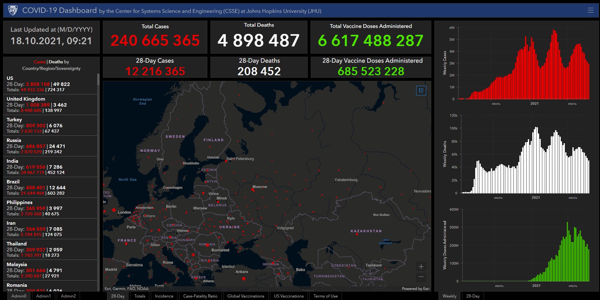 Всего в мире коронавирусом заразились 240 миллионов 665 тысяч 365 человек. Больше всего зараженных в США (44 миллиона 933 тысячи 336), Индии (34 миллиона 67 тысяч 719), Бразилии (21 миллион 644 тысячи 464), Франции (7 миллионов 189 тысяч 566), Великобритании (8 миллионов 488 тысяч 685), России (7 миллионов 870 тысяч 529), Турции (7 миллионов 630 тысяч 133), Аргентине (5 миллионов 272 тысячи 551), Иране (5 миллионов 784 тысячи 815), Колумбии (4 миллиона 981 тысяча 532), Испании (4 миллиона 984 тысячи 386), Италии (4 миллиона 717 тысяч 899) и Германии (4 миллиона 382 тысячи 19).