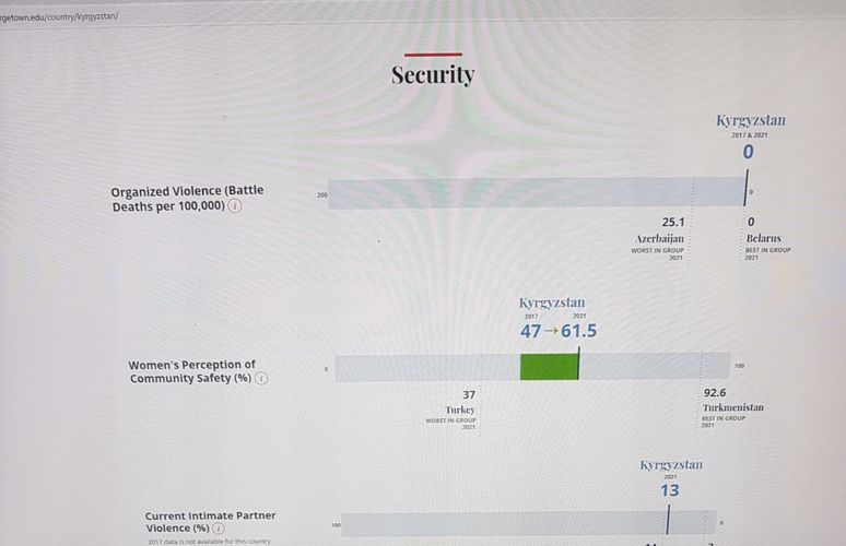 76,9 процента женщин в КР не подвергаются правовой дискриминации. 13 процентов женщин регулярно подвергаются семейному насилию.