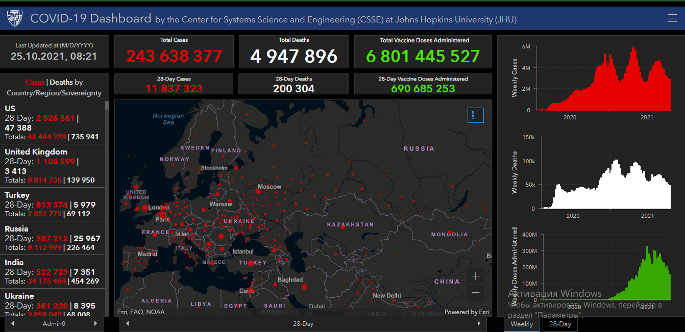 COVID-19 в мире. Заразились более 243,6 миллиона, умерли более 4,9 миллиона