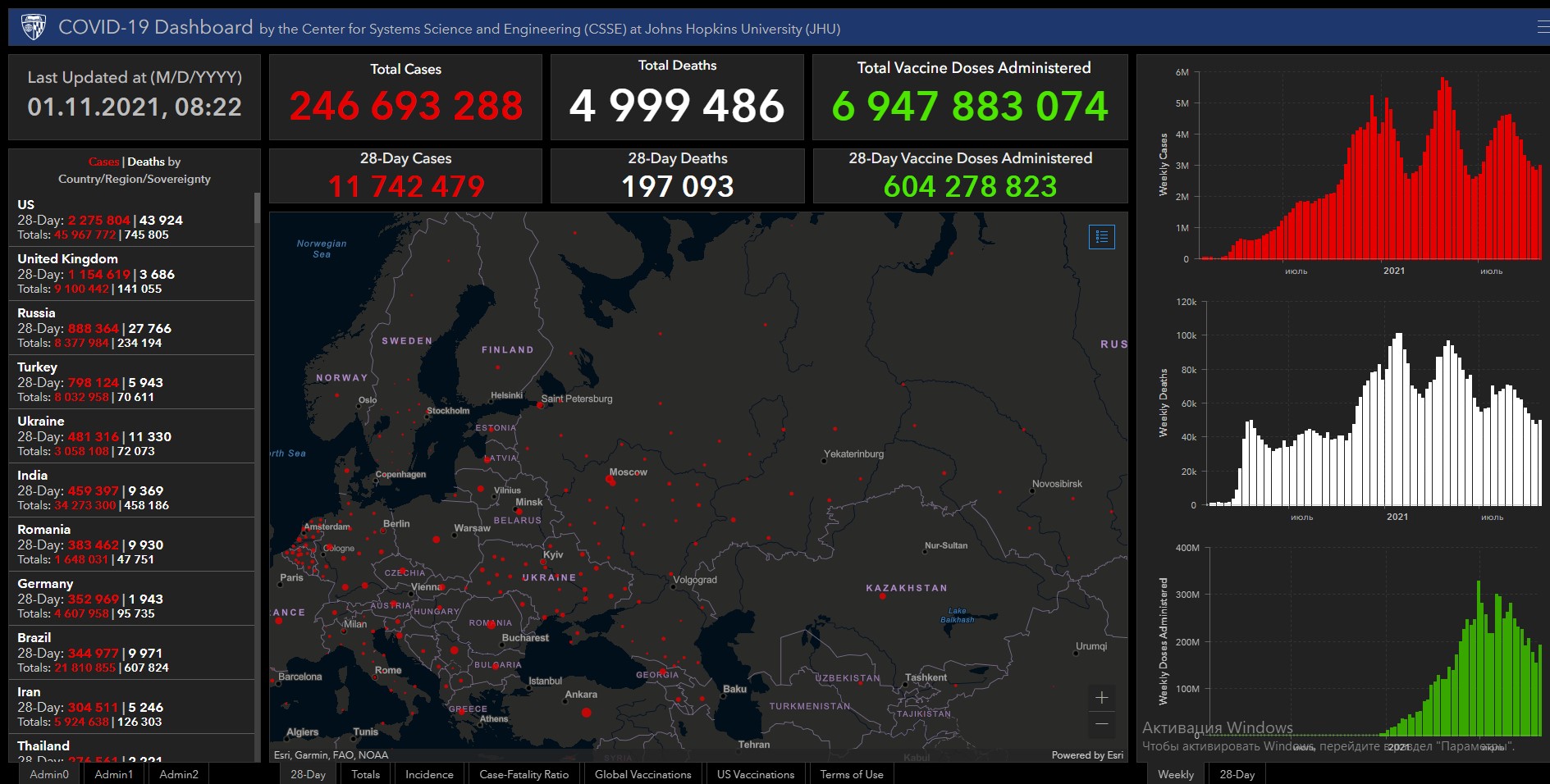 Всего в мире коронавирусом заразились 246 миллионов 693 тысячи 288 человек. Больше всего зараженных в США (45 миллионов 967 тысяч 772), Индии (34 миллиона 273 тысячи 300), Бразилии (21 миллион 810 тысяч 855), Франции (7 миллионов 268 тысяч 527), Великобритании (9 миллионов 100 тысяч 442), России (8 миллионов 377 тысяч 984), Турции (8 миллионов 32 тысячи 958), Аргентине (5 миллионов 288 тысяч 807), Иране (5 миллионов 924 тысячи 638), Колумбии (5 миллионов 2 тысячи 387), Испании (5 миллионов 11 тысяч 148), Италии (4 миллиона 771 тысяча 965) и Германии (4 миллиона 607 тысяч 958).
