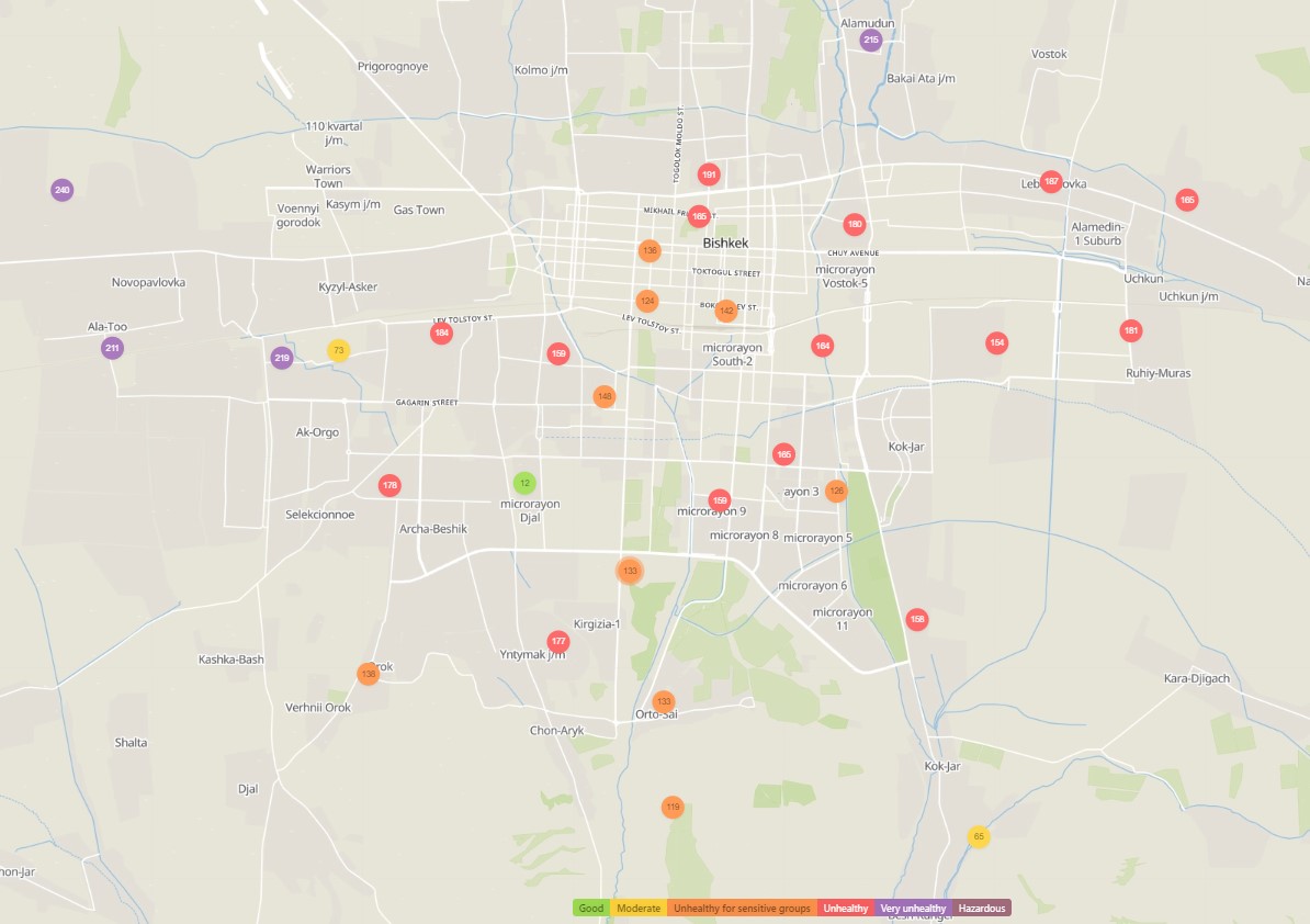 Общественный фонд «Институт экологических решений» установил датчики в столице и пригороде. На карте можно увидеть среднее значение AQI в разных районах Бишкека. Его обновляют ежечасно.