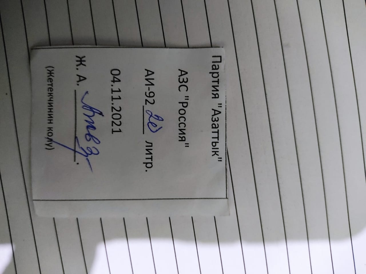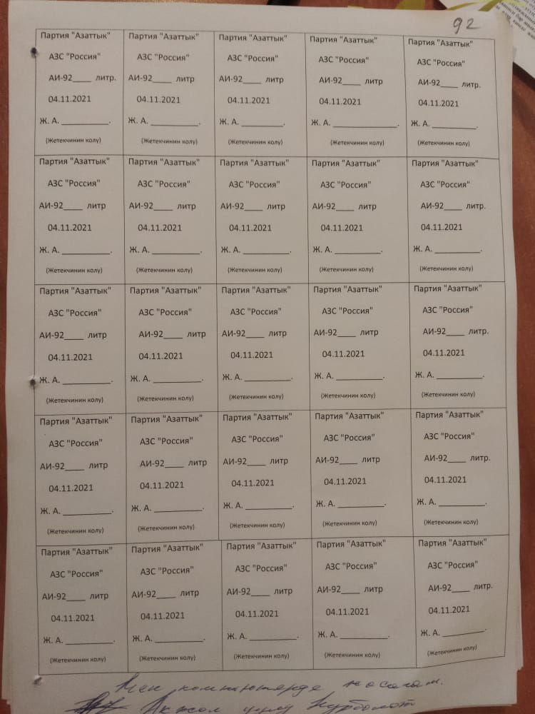 Отмечается, что 4 ноября примерно в 17.40 представитель «Азаттыка» приехал на автозаправочную станцию, собрал розданные талоны и окончательно рассчитался с оператором. Стало известно, что представитель партии оплатил в общей сложности 80 тысяч сомов.