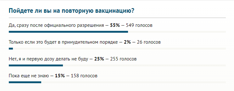 Больше половины проголосовавших ответили, что пойдут снова за прививкой сразу после официального разрешения. При этом четверть проголосовавших не намерены вакцинироваться вовсе. Пока еще не определились с выбором 15 процентов принявших участие в опросе и лишь 2 процента согласны получить вакцину повторно только в принудительном порядке.