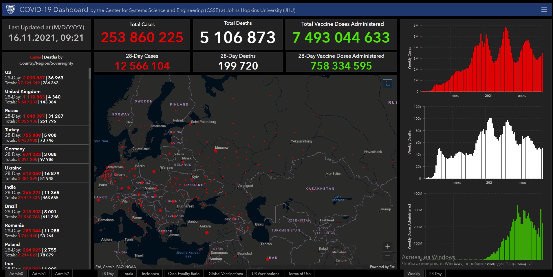 Всего в мире коронавирусом заразились 253 миллиона 860 тысяч 225 человек. Больше всего зараженных в США (47 миллионов 221 тысяча 549), Индии (34 миллиона 447 тысяч 536), Бразилии (21 миллион 960 тысяч 766), Франции (7 миллионов 393 тысячи 296), Великобритании (9 миллионов 649 тысяч 233), России (8 миллионов 956 тысяч 136), Турции (8 миллионов 433 тысячи 988), Аргентине (5 миллионов 307 тысяч 159), Иране (6 миллионов 45 тысяч 212), Колумбии (5 миллионов 34 тысячи 266), Испании (5 миллионов 56 тысяч 954), Италии (4 миллиона 865 тысяч 260) и Германии (5 миллионов 91 тысяча 200).