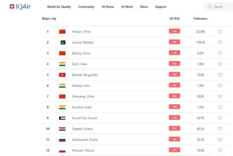 В 18.00 статус города отмечен как «нездоровый». Индекс качества воздуха, по данным сайта, составляет 166 (AQI).