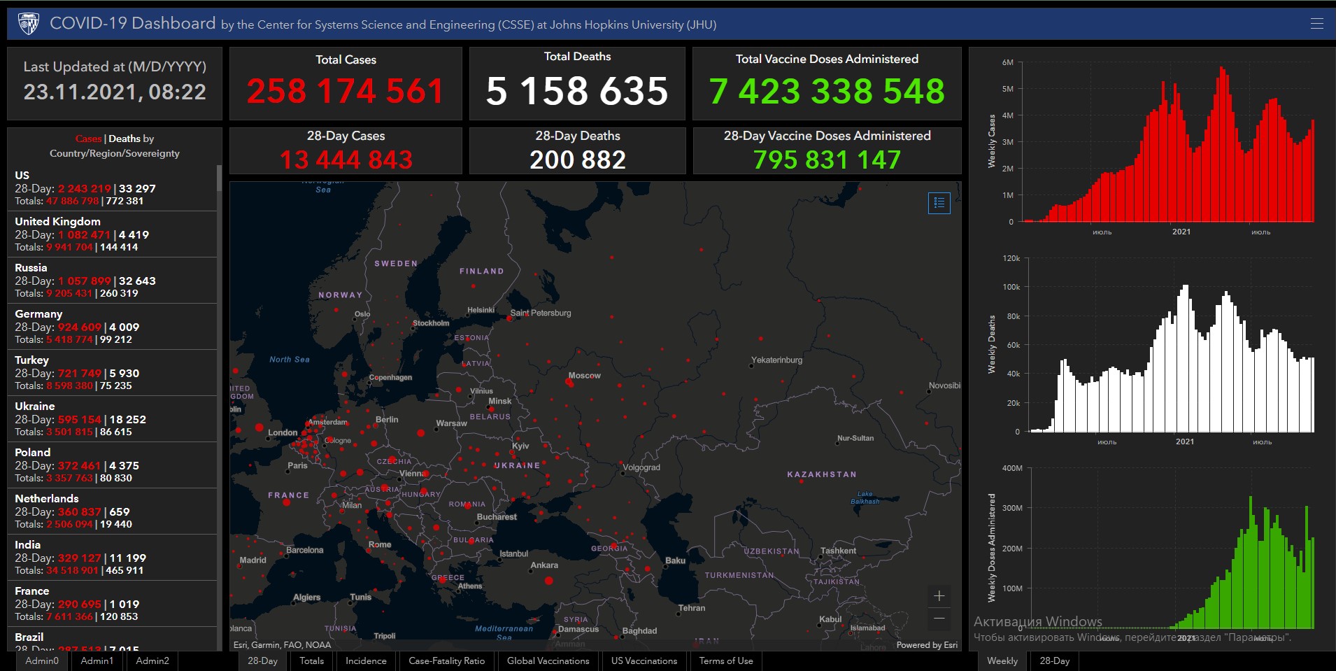 Всего в мире коронавирусом заразились 258 миллионов 174 тысячи 561 человек. Больше всего зараженных в США (47 миллионов 886 тысяч 798), Индии (34 миллиона 518 тысяч 901), Бразилии (22 миллиона 20 тысяч 412), Франции (7 миллионов 611 тысяч 366), Великобритании (9 миллионов 941 тысяча 704), России (9 миллионов 205 тысяч 431), Турции (8 миллионов 598 тысяч 380), Аргентине (5 миллионов 315 тысяч 989), Иране (6 миллионов 82 тысячи 865), Колумбии (5 миллионов 50 тысяч 255), Испании (5 миллионов 96 тысяч 538), Италии (4 миллиона 932 тысячи 91) и Германии (5 миллионов 418 тысяч 774).