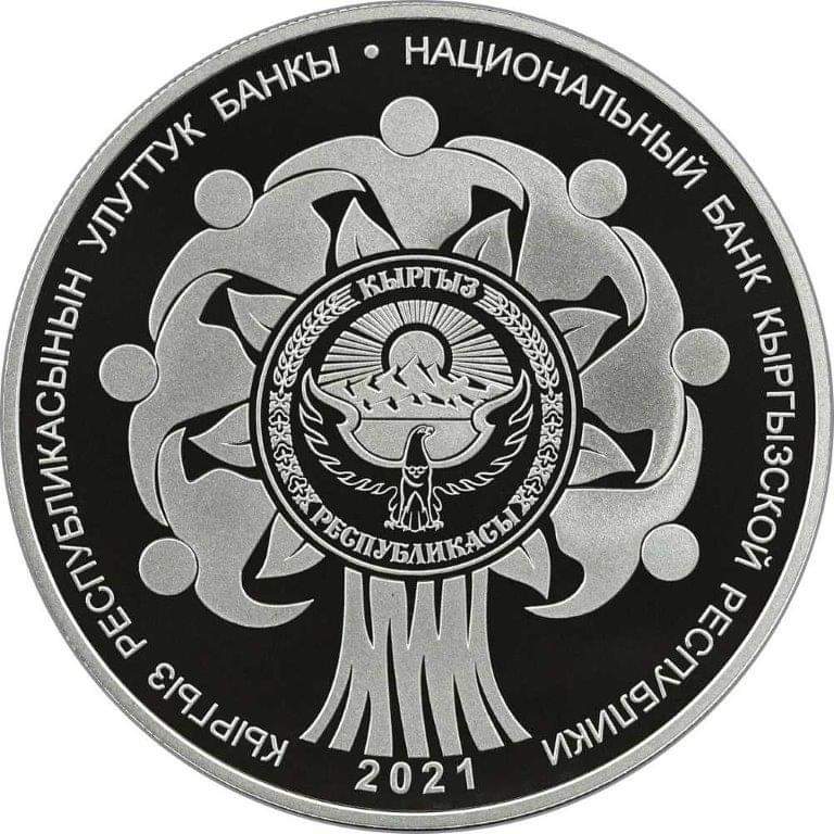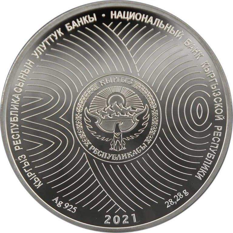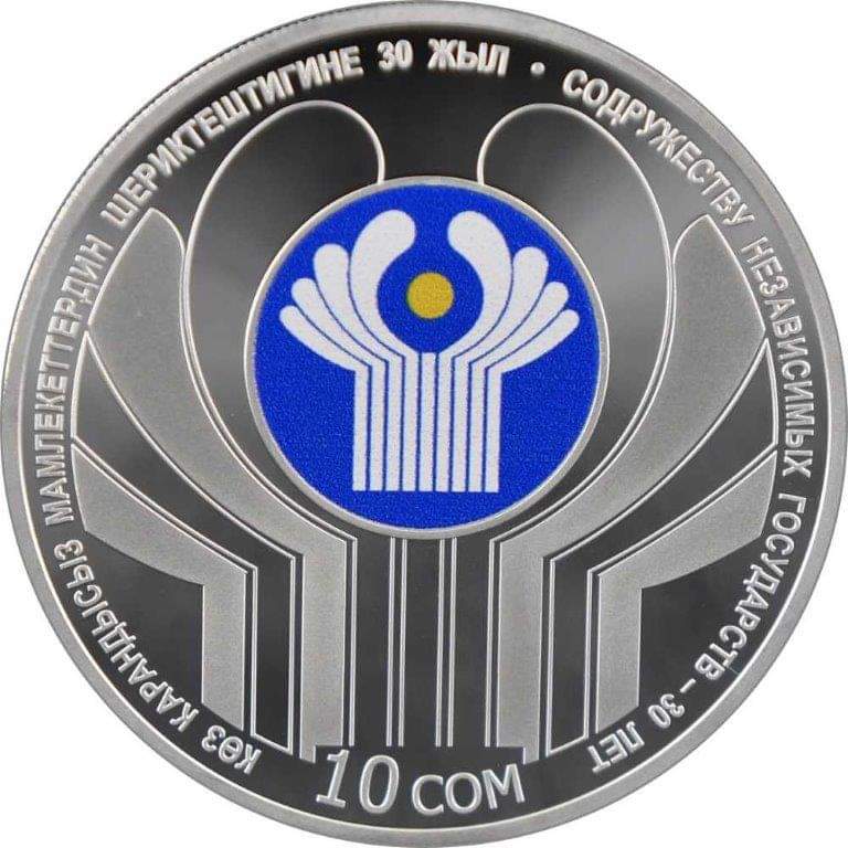 По его данным, основным сюжетом лицевой стороны серебряной монеты «Содружеству Независимых Государств — 30 лет» является изображение эмблемы СНГ. В нижней части указан ее номинал — «10 сомов».
