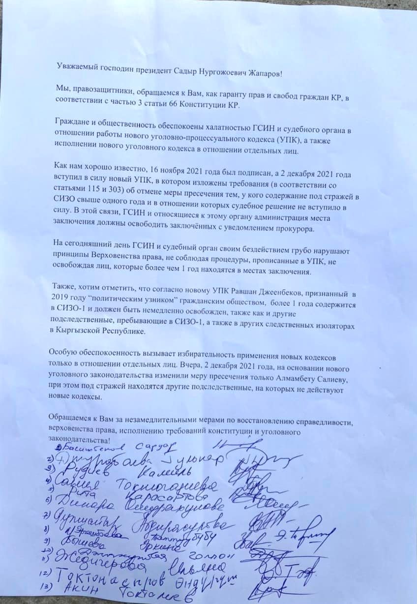 «2 декабря на основании нового уголовного законодательства изменили меру пресечения только Алмамбету Салиеву, а другие подследственные остались под стражей. Надо незамедлительно восстановить справедливость, верховенство права, исполнить требования Конституции и уголовного законодательства», — заключили правозащитники.