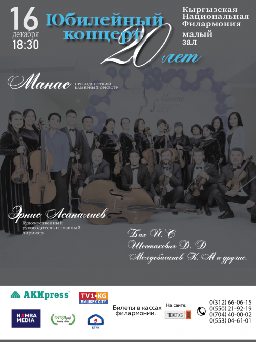 В 20-летие оркестра артисты сыграют любимые композиции. Основатель — художественный руководитель, главный дирижер, народный артист Кыргызской Республики Эрнис Асаналиев. Ведущий концерта — Керим Шатманов.