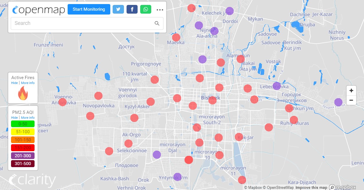 Посольство США в Кыргызстане также установило датчик. Информация обновляется каждый час. Индекс качества воздуха в районе дипломатической миссии — 172 (AQI).
