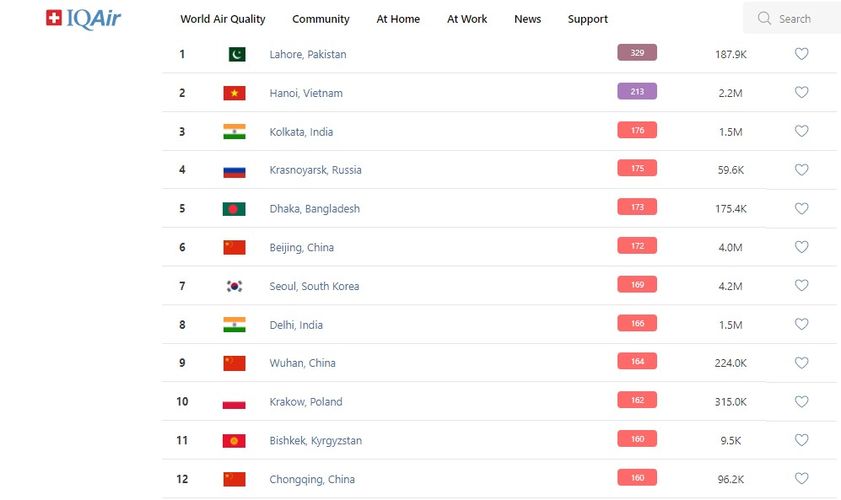 В 18.00 статус города отмечен как «нездоровый». Индекс качества воздуха, по данным сайта, составляет 160 (AQI).