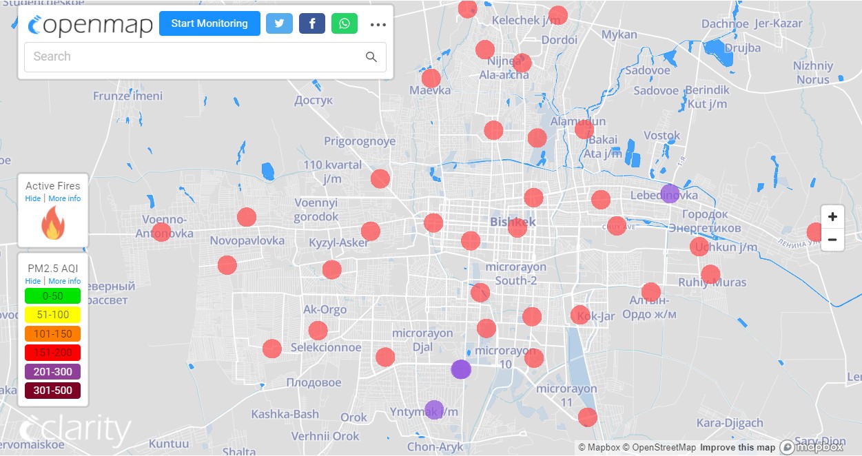 Посольство США в Кыргызстане также установило датчик. Информация обновляется каждый час. Индекс качества воздуха в районе дипломатической миссии — 228 (AQI).