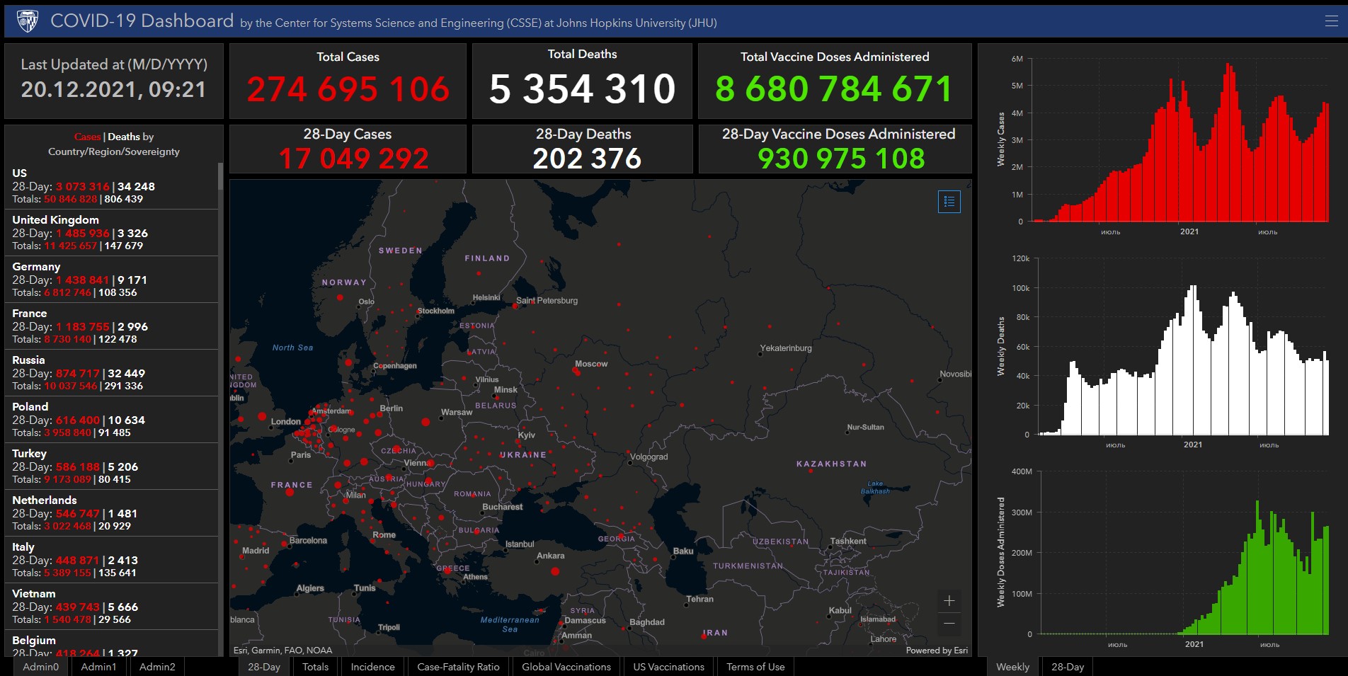 Всего в мире коронавирусом заразились 274 миллиона 695 тысяч 106 человек. Больше всего зараженных в США (50 миллионов 846 тысяч 828), Индии (34 миллиона 740 тысяч 275), Бразилии (22 миллиона 213 тысяч 762), Франции (8 миллионов 730 тысяч 140), Великобритании (11 миллионов 425 тысяч 657), России (10 миллионов 37 тысяч 546), Турции (9 миллионов 173 тысячи 89), Аргентине (5 миллионов 389 тысяч 707), Иране (6 миллионов 170 тысяч 979), Колумбии (5 миллионов 107 тысяч 323), Испании (5 миллионов 455 тысяч 527), Италии (5 миллионов 389 тысяч 155) и Германии (6 миллионов 812 тысяч 746).