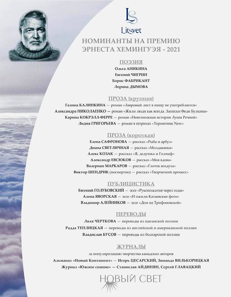 Объявлены номинанты на премию имени Эрнеста Хемингуэя по версии журнала «Новый свет». Об этом сообщается на официальном сайте.