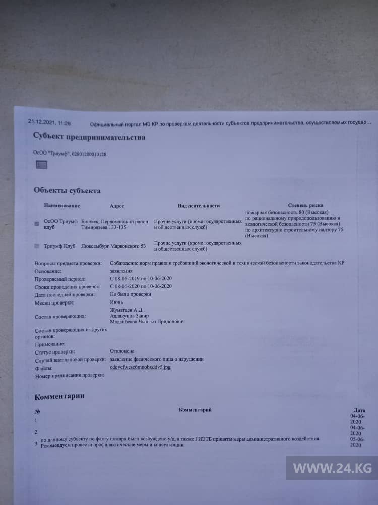 В Государственную инспекцию по экологической и технической безопасности поступило не одно письмо от жителей улицы Тимирязева с жалобой на ОсОО «Триумф клуб». Они просили проверить и закрыть кустарное производство.Начальник управления инспекции по пожарной безопасности по Бишкеку и Чуйской области Салмоорбек Карагулов отметил, что после обращения жителей Госэкотехинспекция неоднократно обращалась в Минэкономики с просьбой провести внеплановую проверку объекта. Все обращения министерство отклонило.