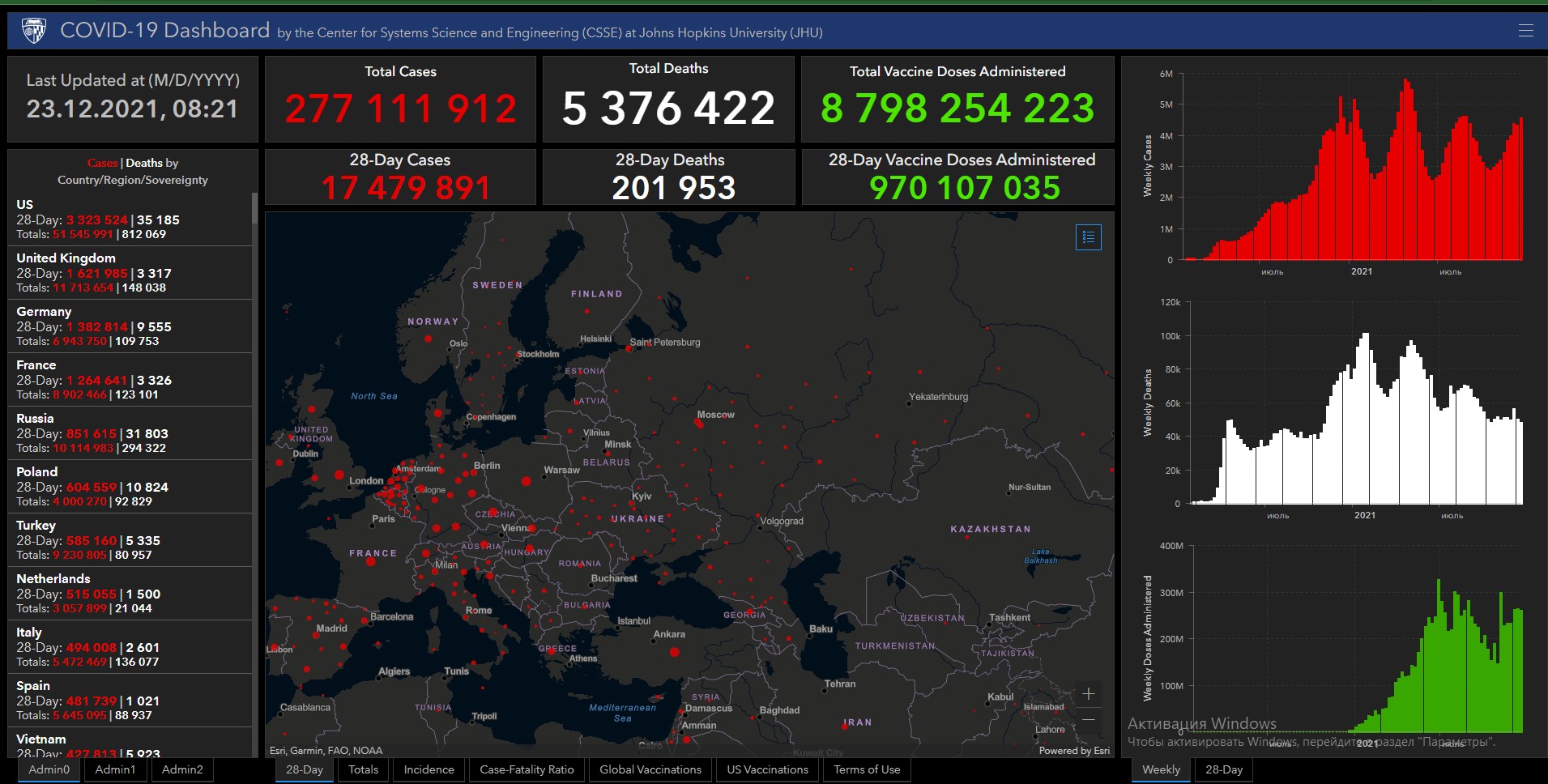 Всего в мире коронавирусом заразились 277 миллионов 111 тысяч 912 человек. Больше всего зараженных в США (51 миллион 545 тысяч 991), Индии (34 миллиона 758 тысяч 481), Бразилии (22 миллиона 222 тысячи 928), Франции (8 миллионов 902 тысячи 466), Великобритании (11 миллионов 713 тысяч 654), России (10 миллионов 114 тысяч 983), Турции (9 миллионов 230 тысяч 805), Аргентине (5 миллионов 415 тысяч 501), Иране (6 миллионов 177 тысяч 885), Колумбии (5 миллионов 112 тысяч 719), Испании (5 миллионов 645 тысяч 95), Италии (5 миллионов 472 тысячи 469) и Германии (6 миллионов 943 тысячи 750).
