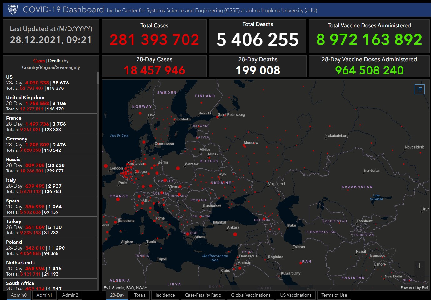 Всего в мире коронавирусом заразились 281 миллион 393 тысячи 702 человека. Больше всего зараженных в США (52 миллиона 793 тысячи 407), Индии (34 миллиона 793 тысячи 333), Бразилии (22 миллиона 250 тысяч 218), Франции (9 миллионов 251 тысяча 21), Великобритании (12 миллионов 277 тысяч 914), России (10 миллионов 236 тысяч 301), Турции (9 миллионов 335 тысяч 193), Аргентине (5 миллионов 480 тысяч 305), Иране (6 миллионов 186 тысяч 729), Колумбии (5 миллионов 127 тысяч 971), Испании (5 миллионов 932 тысячи 626), Италии (5 миллионов 678 тысяч 112) и Германии (7 миллионов 28 тысяч 398).