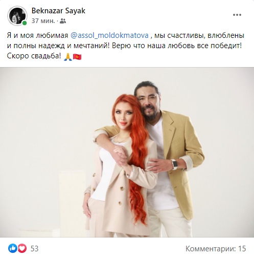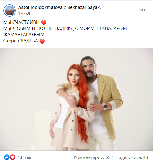 «Мы счастливы. Мы любим и полны надежд с моим Бекназаром Жамангараевым. Скоро свадьба», — написала Ассоль Молдокматова в Facebook.