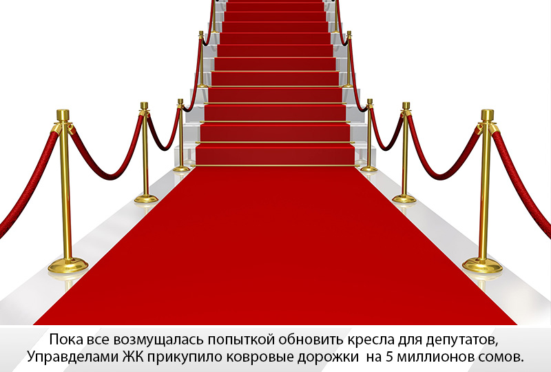 Пока новоявленные депутаты парламента обсуждали итоги выборов и возможные составы коалиции большинства, делили мандаты и судились с ЦИК (смотри пункт 1), Управление делами ЖК КР тоже не дремало. Оно объявило тендер на покупку 120 новых кресел для Жогорку кенеша за 2 миллиона 682 тысячи сомов, оценив каждую пятую точку народных избранников в 22 тысячи 350 сомов. Практически сразу общество и СМИ отреагировали шквалом критики. В Управделами начали неуклюже оправдываться, но только подлили масла в огонь. Дело исправили отменой тендера и поспешили заверить, что его объявили без согласования с торага.