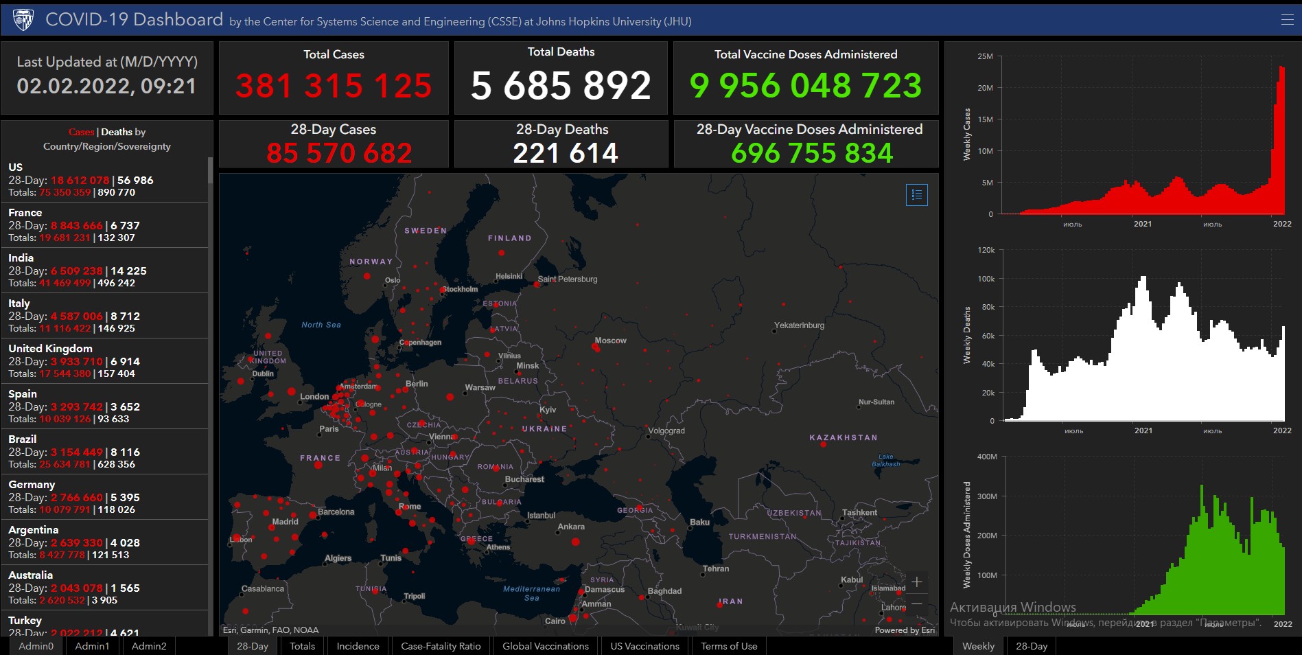 Всего в мире коронавирусом заразились 381 миллион 315 тысяч 125 человек. Больше всего зараженных в США (75 миллионов 350 тысяч 359), Индии (41 миллион 469 тысяч 499), Бразилии (25 миллионов 634 тысячи 781), Франции (19 миллионов 681 тысяча 231), Великобритании (17 миллионов 544 тысячи 380), России (11 миллионов 795 тысяч 59), Турции (11 миллионов 722 тысячи 483), Аргентине (8 миллионов 427 тысяч 778), Иране (6 миллионов 408 тысяч 244), Колумбии (5 миллионов 901 тысяча 715), Испании (10 миллионов 39 тысяч 126), Италии (11 миллионов 116 тысяч 422) и Германии (10 миллионов 79 тысяч 791).