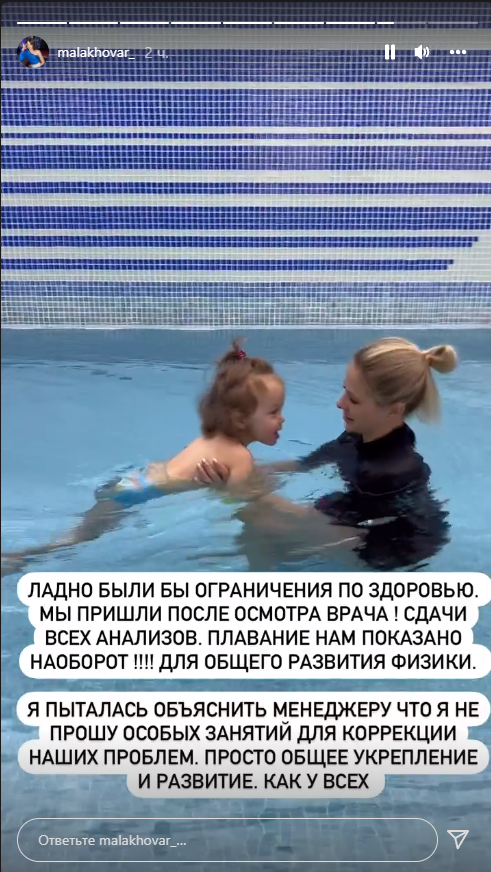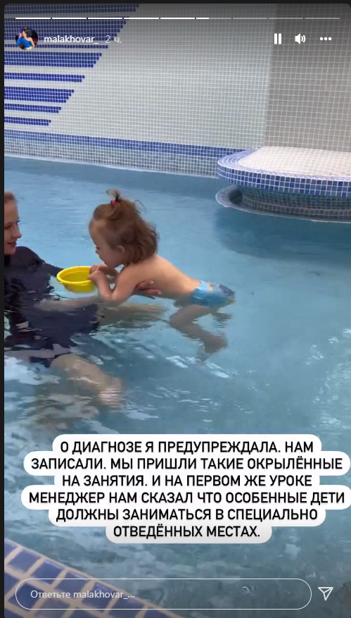 «Сегодня в Avangard sportclub нам не разрешили ходить на плаванье из-за диагноза ДЦП. О диагнозе я предупреждала. Мы пришли окрыленные, но на первом же уроке менеджер сказал, что особенные дети должны заниматься в специально отведенных местах. Ладно были бы ограничения по здоровью. Мы пришли после осмотра врача, сдачи всех анализов. Плавание нам показано для общего развития физики. Я пыталась объяснить менеджеру, что не прошу особых занятий для коррекции наших проблем. Просто общее укрепление и развитие. Как и у всех», — написала женщина.