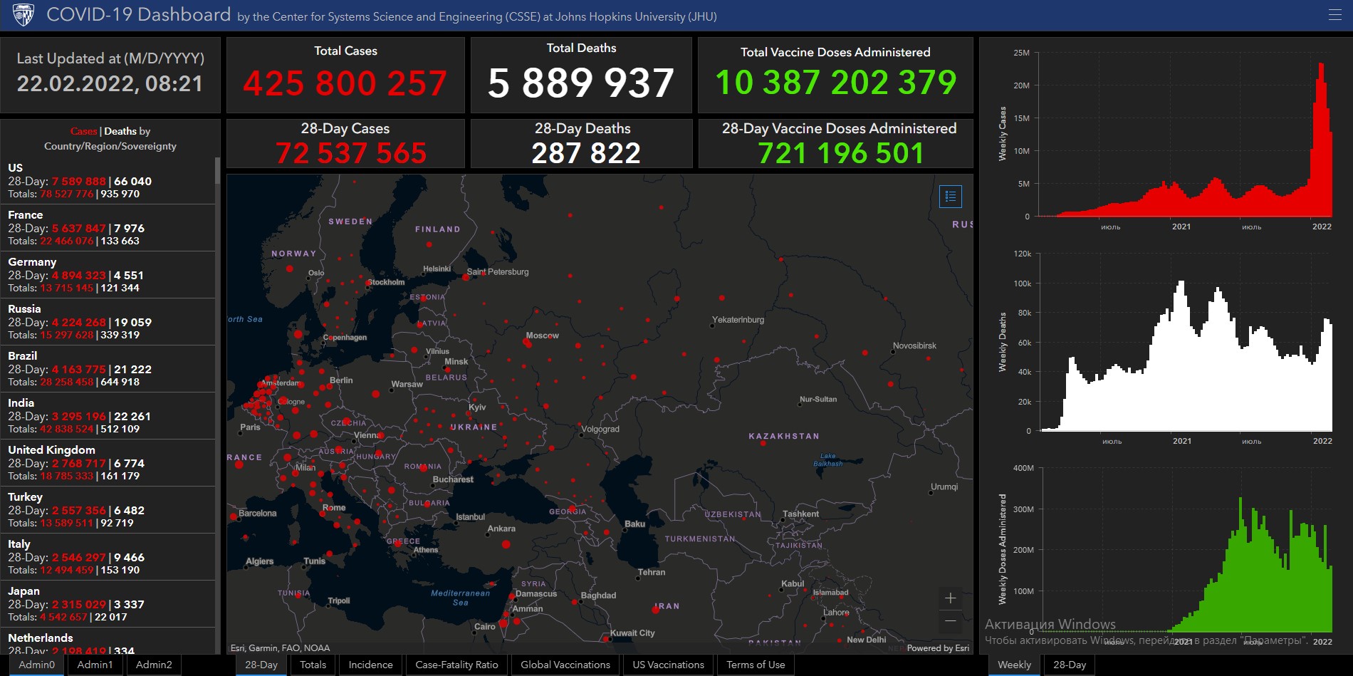 Всего в мире коронавирусом заразились 425 миллионов 800 тысяч 257 человек. Больше всего зараженных в США (78 миллионов 527 тысяч 776), Индии (42 миллиона 838 тысяч 524), Бразилии (28 миллионов 258 тысяч 458), Франции (22 миллиона 466 тысяч 76), Великобритании (18 миллионов 785 тысяч 333), России (15 миллионов 297 тысяч 628), Турции (13 миллионов 589 тысяч 511), Аргентине (8 миллионов 838 тысяч 674), Иране (6 миллионов 961 тысяча 562), Колумбии (6 миллионов 49 тысяч 952), Испании (10 миллионов 858 тысяч), Италии (12 миллионов 494 тысячи 459) и Германии (13 миллионов 715 тысяч 145).